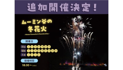 ムーミン物語は、同社の運営する「ムーミンバレーパーク」(埼玉県飯能市)における冬のイベント「ウインターワンダーランド イン ムーミンバレーパーク 2023」期間中に開催している「ムーミン谷の冬花火」を、好評につき11月の土曜日に加えて、12月の土日および1月の特別日にも開催する(12月31日のみ、時短営業のため開催はなし)。
