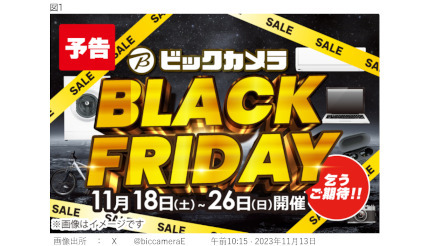 それはともかく、23年のブラックフライデーのセールが気になったためネットで調べだしたところ、ちょうど、ビックカメラの開催がXで発信(11月13日午前10時15分)された。それによると開催は2023年11月18日(土)~26日(日)とのこと。さらに調べてみると、店舗とECサイトの開催で、ビックカメラ・ドットコムは、17日(金)22時から先行スタートとなっていた。