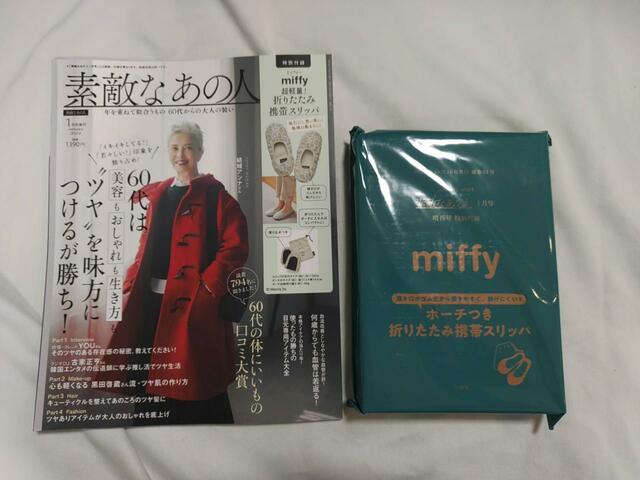 『素敵なあの人』1月号の付録は、通常号がミッフィーの身だしなみを整える「8点セット」。増刊号は、折りたたんで持ち運べる「携帯スリッパ」です。