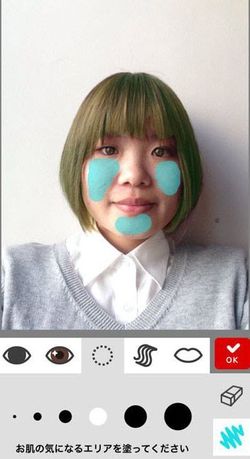 いずれも操作は一緒。アイコンをタップし、デコりたい部分を青いマーカーで塗りつぶすだけ。あとはお好みの色を選択すれば、髪の色や瞳の色など思い通りにチェンジ。肌の気になる部分も同じ方法で修正できるから、よりナチュラルな仕上がりになります。