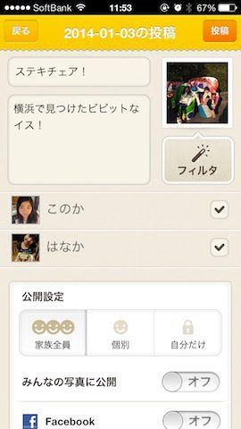 たとえば、子供の成長をガラケーしか使えないおじいちゃんやおばあちゃんに送りたいならこちら。最大10名まで共有できるメンバーを事前に登録できるから、家族や大切な友達とのプライベートアルバムとして利用することができます。