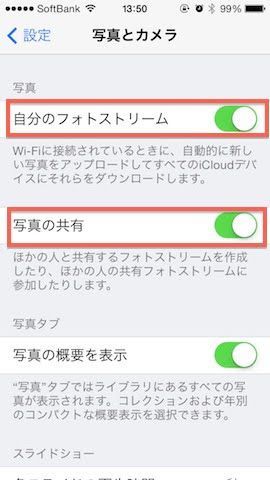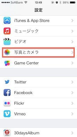 1.まずは設定から「フォトストリーム」を有効にしましょう。ホーム画面の「設定」アプリを開いて、「写真とカメラ」をタップします。「自分のフォトストリーム」と「写真の共有」のそれぞれのスイッチをオンに。