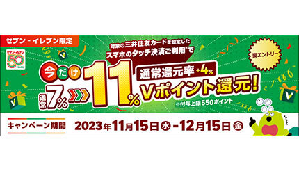 三井住友カードは、要エントリーのお得なキャンペーン「全国のセブン‐イレブンでスマホのタッチ決済を使うと、Vポイント7%還元のところ、キャンペーン期間中ならもれなく11%還元!」を11月15日から12月15日まで実施する。