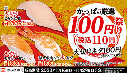 カッパ・クリエイトは11月16~29日の期間、回転寿司チェーン「かっぱ寿司」全店で(久居店は11月17日から)、「厳選100円(税込110円)祭り」を開催する。