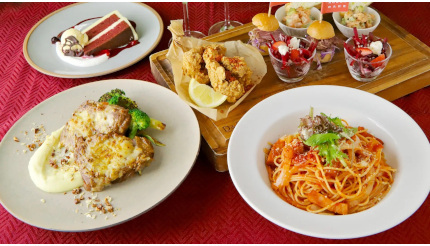 限定メニューの提供は12月1~25日。ディナーは、2人でのデートからグループでのパーティーに対応したシェアコースを用意。メニューは、「苺とビーツ、キヌアの赤いサラダ」「マリネサーモンとアボカドのタルタル」「自家製パストラミとレッドキャベツのフィンガーバーガー」「ドラムチキンフリット」「淡路玉ねぎとベーコンのアマトリチャーナ」「栗豚のグリル ポルチーニのグラタン仕立て」「レッドベルベッドケーキ」で、価格が1人当たり3000円。
