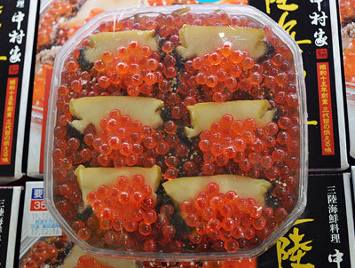 お次は、東北に戻って岩手・釜石の中村家から三陸海宝漬。メカブのしょうゆ漬けにアワビ、イクラをトッピングしたさまは何とも贅沢です。1パック3,300円(350g)。