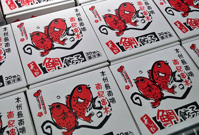 和歌山・南紀串本からは珍しい鯛餃子。1箱30個入りで2,300円。焼き上がりを見ると普通の餃子ですが、低カロリー、高タンパク質のヘルシー餃子です。オンラインショップで購入可能です。