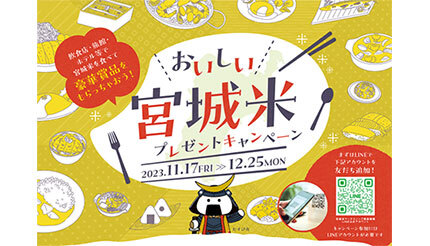 宮城米マーケティング推進機構(会長は村井嘉浩宮城県知事)は11月17日~12月25日まで「おいしい宮城米プレゼントキャンペーン」を実施する。対象店舗で商品を購入するとポイントが貯まり、応募ポイントに応じて、仙台牛や宮城米などが当たるスタンプラリーキャンペーンだ。