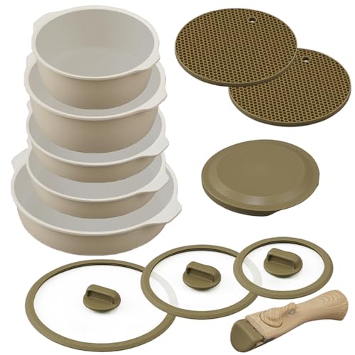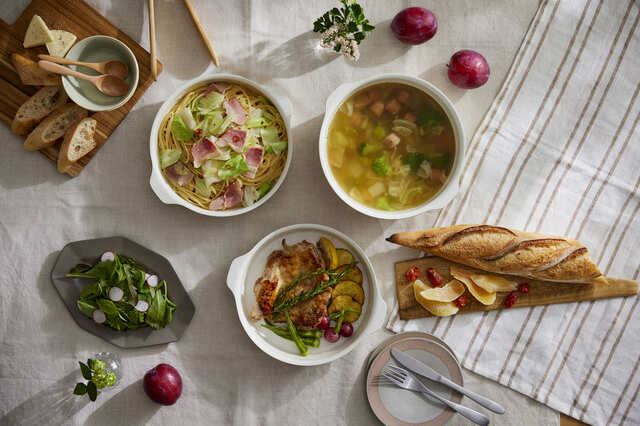 全3種類のセット(6点、8点、12点)には、ガラスふた、保存時に役立つPEシールふた、取り外して使えるマルチハンドルや鍋敷きが含まれており、全てを重ねて収納できるので限られた大きさのキッチンでも収納が可能に。まさに省家事・省空間!