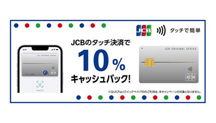 ジェーシービーは、11月16日から12月15日まで、対象店舗で「JCBのタッチ決済」利用金額の10%をもれなくキャッシュバックする「JCBのタッチ決済キャンペーン」を実施する。