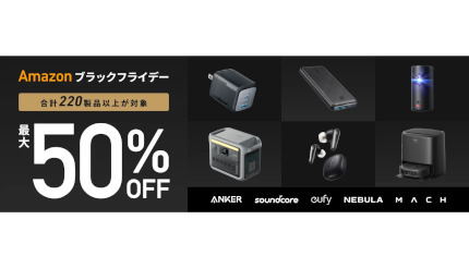 アンカー・ジャパンは、Amazon.co.jpが11月24日0時~12月1日23時59分の期間に開催する、恒例のビッグセール「Amazonブラックフライデー」において、最新のポータブル電源や人気の完全ワイヤレスイヤホンを含むチャージング関連製品やオーディオ製品、家電製品など220製品以上を、最大50%オフで販売する。