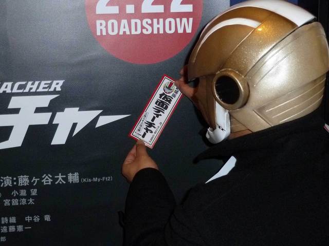 ここで配ったのは、ウレぴあ総研とコラボした(してくれた)「仮面ティーチャー」の千社札シール。仮面宣伝マンは来場記念にバナーにシールをはり、退出した。