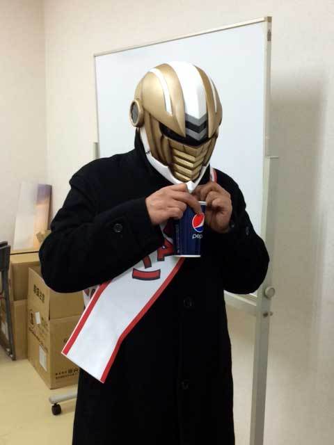 最後にお世話になった支配人と記念ポーズを撮り、フォーラム八戸を後にした仮面宣伝マンは次の目的地、岩手県盛岡市へ移動。移動中は駅弁で、体力を充電していた。