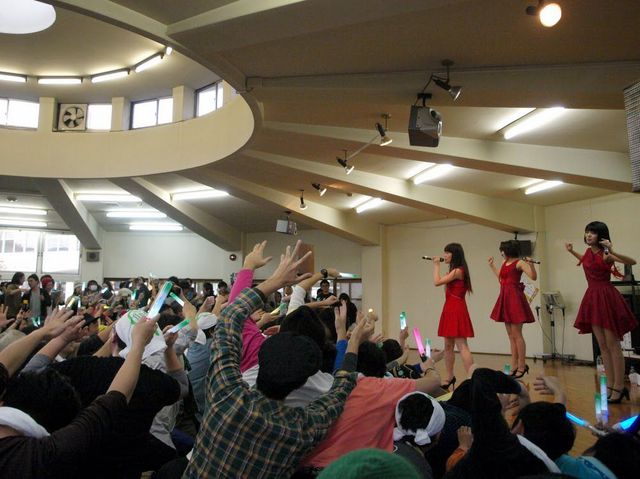 「音泉温楽」という、DJイベントを温泉の宴会場でやってしまおう!というイベントに登場したNegicco。温泉の外観からして期待が膨らみます。会場内もものすごく昭和レトロで、その中にたっくさんのお習字(書き初め?)が。2階のこれまた昭和な個室で物販をしていたNegiccoの面々がスタンバイに入ります。