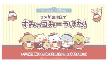 コメダは12月1日~2024年1月28日の期間、全国の「コメダ珈琲店」と「おかげ庵」にて、「すみっコぐらし」とのコラボレーション「コメダ珈琲店ですみっコみーつけた!」を実施する。