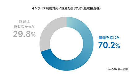 調査対象者のうち、経理部門(500名)にインボイス制度への対応に何らかの業務課題を感じているかを尋ねたところ、「課題を感じた」という回答が70.2%を占めた。