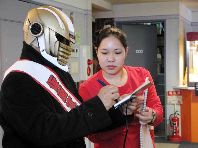 しかも、劇場スタッフもフレンドリーで、仮面ティーチャーと黒の仮面ティーチャーのお面まで用意してくれたから、ファンの人たちはそれを自分の顔の前に持ってきて、仮面宣伝マンと仲よく写真撮影。
