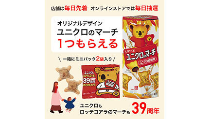 11月23日から26日までの4日間、店頭では毎日先着順に、ユニクロ×ロッテコアラのマーチ 39周年コラボオリジナルパッケージの「ユニクロのマーチ」をプレゼントする。オンラインストアでは毎日抽選でプレゼントとなる。配布総数は店舗約60万点、オンラインストア約15.5万点。
