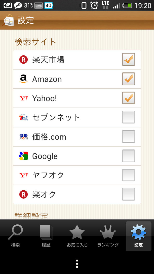 キーワードもしくはバーコードを使って検索すると、複数のショッピングサイトでの販売価格を横並びで表示してくれます。検索できるサイトは設定可能で、Amazon、楽天市場、Yahoo!ショッピングのほか、セブンネットショッピング、価格.comに加え、Yahoo!オークションなどのオークションサイトも調べられます。