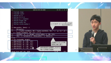 経済産業大臣賞・アイデアを受けた、小林悠太さんの作品「関数型のコンパイラ言語Yet」は、数式をそのままに近い形で書ける特徴をもつプログラミング言語。小林さんはもともとコンピュータと数学が好きだった。しかし、既存のプログラミング言語で数式を表現しようとすると、どうしても冗長になってしまう。そのため新たな言語を開発した。作品は、数式をシンプルに書けるプログラミング言語とそれを動かすオリジナルの仮想環境、機械語の組み合わせ。数式に近い記法を採用しているため直感的に書ける。if文、for文のような文が不要で、条件分岐は三項演算子、if関数、繰り返しは再帰など、式を使って処理する。また、誰でも使えるようマニュアルも作成。仕様を網羅し分かりやすくした。サンプルコードに加え、Lisp言語への変換機能についても解説している。小林さんは「言語を設計し、仮想環境をつくってコンピュータの仕組みを深く知ることができ、動いているところを見て楽しいと感じた。今後はオープンソース化し、いろいろな人が改良できるようにしたい。と語った。また表彰式では「初めての参加で経済産業大臣賞をいただけてうれしい。これからもプログラミングを頑張っていきたい」と話した。