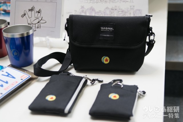 バッグやTシャツのワンポイントにピクサーボールがついたオシャレなアイテムが並びます。