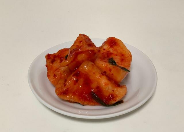 こちらのキムチは、大きく切られた大根がメインとなっています。噛み応え、食べ応え抜群の一品で、辛さは中辛程度、酸味はほぼありません。