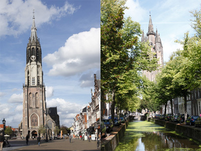 マルクト広場にある新教会(写真左)・フェルメールが埋葬されたデルフト旧教会(写真右)