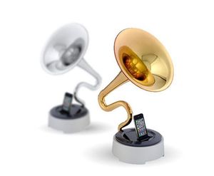 とてもユニークでノスタルジックなラッパのデザインは、蓄音機を連想させます。S字型部分は楽器職人によって一つひとつ手作業でつくられているそうです。コンサート会場のライブのような音が楽しめます。