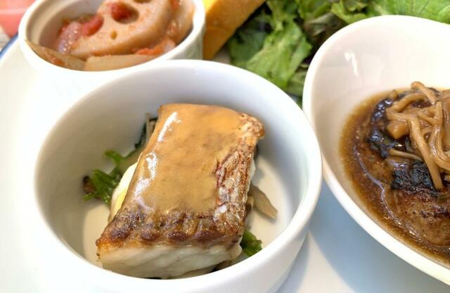 どれもおいしそうですが、今回はこの中から、ハンバーグと白身魚のポワレ、根菜のラタㇳゥイユを選びました。本日のスープ付きで税込み1,400円です。スープなしなら1,300円。