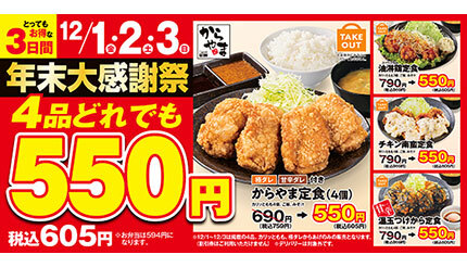 エバーアクションは12月1~3日の3日間、国内のからあげ定食専門店「からやま」で年末大感謝祭を開催する。一番人気の「からやま定食(4個)」をはじめ人気の定食4品がどれでも605円。からあげ2種を各種1個110円と、お得な特別価格で販売する。