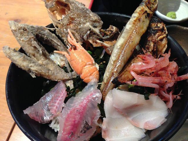 ドーン! これが深海魚丼です。どれがどの魚なのかよくわからないのですが、とても美味でした。揚げ物は骨も頭も全部食べられます。