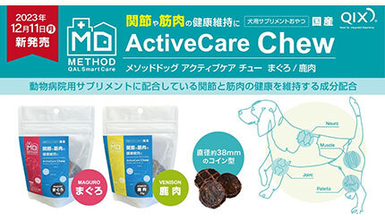 QIXは、犬用サプリメントおやつ「METHOD Dog ActiveCare Chew(メソッドドッグ アクティブケア チュー) まぐろ(53g)」と「METHOD Dog ActiveCare Chew 鹿肉(53g)」を12月11日に発売する。