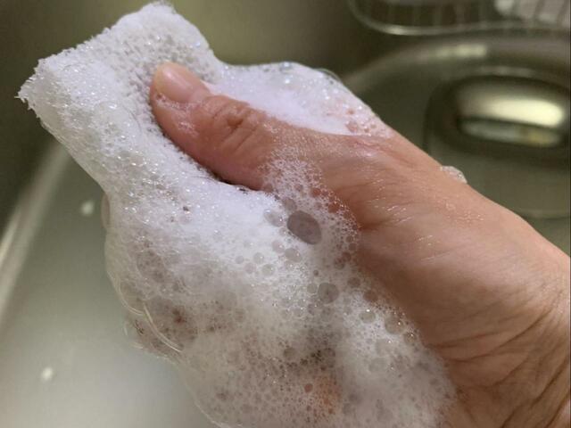 また、空気をふくみやすい設計になっているため、いつもの洗剤の量でも泡立ちは申し分ないです。炒め物をした後のフライパンの汚れも問題なく落とせました。