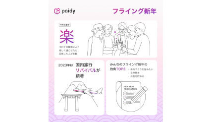 また、23年を振り返って漢字1文字で表すと「楽」が最多だったという。理由は、「旅行に行くことができたから」「1年好きなように楽しめた」「コロナが緩和したから」など。22年の調査で「挑」「進」「幸」など、「前進したい」「躍進したい」という表現が多く見られた一方で今年の漢字が「楽」だったことから、Paidyでは22年の願いを叶えた人が多かったと捉えている。
