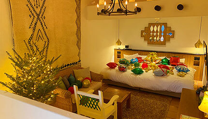 クリスマスステイプランは、テラスに温泉露天風呂とプライベート温水プールを備えた「サンタフェスイート」に泊まれるプランで、2階のベッドルームにはもみの木の大きなツリー、華やかに飾られたバルーンデコレーションなどクリスマスムードにあふれている。