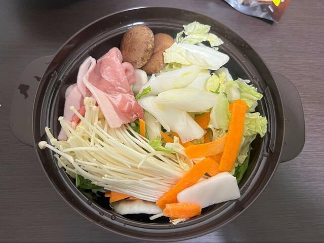 お鍋の材料は豚肉、お鍋用野菜、鍋つゆ(今回はキムチ鍋)です。