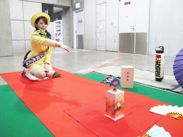さ場内には各地のブースがズラリ。それぞれに趣向を凝らした展示を行っていました。体験コーナーも多数あり、まずは江戸(東京)のお座敷遊び「投扇興」に挑戦。扇子を投げて台の上の扇を落とすのですが、見るとやるとでは大違いで、なかなかむずい! なんとか一度だけ倒すことができました。