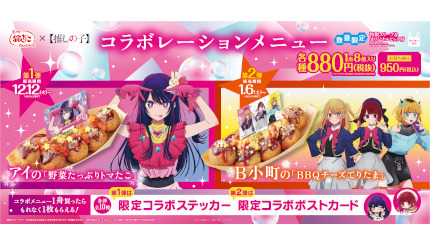 今回のコラボレーションでは、「【推しの子】」に登場するアイやB小町をイメージしたコラボ限定たこ焼きをオリジナルデザインの特製スリーブに入れて数量限定で販売する。各種1舟8個入りで、オリジナルピックと限定コラボグッズが付属。税別価格は880円。
