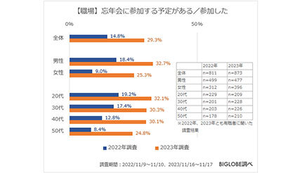 調査対象者のうち、有職者(873名)に職場の忘年会に参加する予定がある、または参加したかを尋ねたところ、「参加する予定がある」「参加した」という回答が2022年調査(14.8%)の約2倍となる、29.3%に達した。