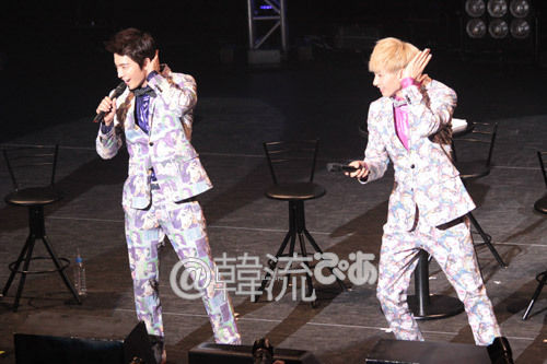 これにドンへが「笑わせ役が必要だったんですよ」と返して笑いを誘った。『Oppa, Oppa』の振付けレクチャーも行われ、手で耳の横の髪をかきあげる仕草の振付けを、ウニョクが「口で『シャー』と声を出しながら踊るのがポイント」と伝え、客席と一緒にダンス。さらに、司会者と通訳にも踊らせるという無茶ぶりも飛び出した。