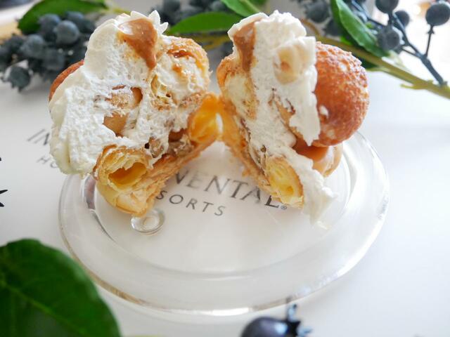 『メープルナッツサントノーレ』は、サクサクのパイ生地が土台になっていて、上品な甘みのメープルクリームが絞られています。