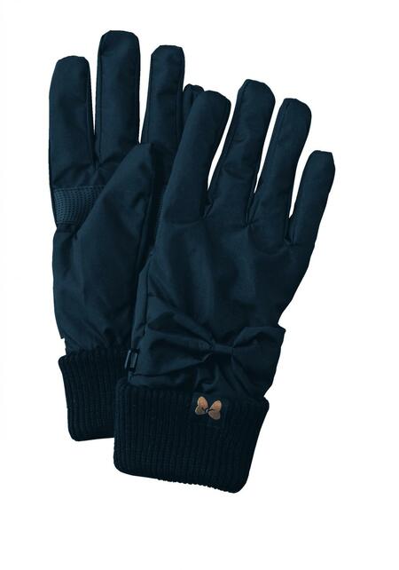 ゴールドのミニーリボンモチーフと、手の甲の大きめネイビーリボンが、エレガントな雰囲気の手袋。