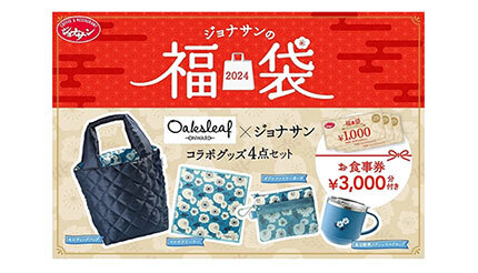 すかいらーくレストランツは、ファミリーレストラン「ジョナサン」でオンワードコーポレートデザインの「Oaksleaf(オークスリーフ)」とコラボした「ジョナサンの福袋」の予約受付を店頭レジで12月14日に開始する。価格は3300円で、数量限定の1万8800個。商品の引き渡し期間は、2024年1月1日から1月14日までとなる。