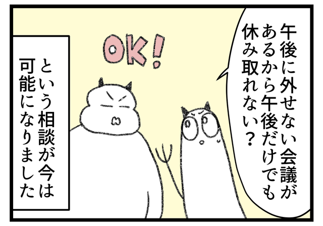 以前は問答無用で私が仕事を調整するしかありませんでしたが、今は夫にも午後だけ休んでもらったりするなどの交渉ができるようになりました。