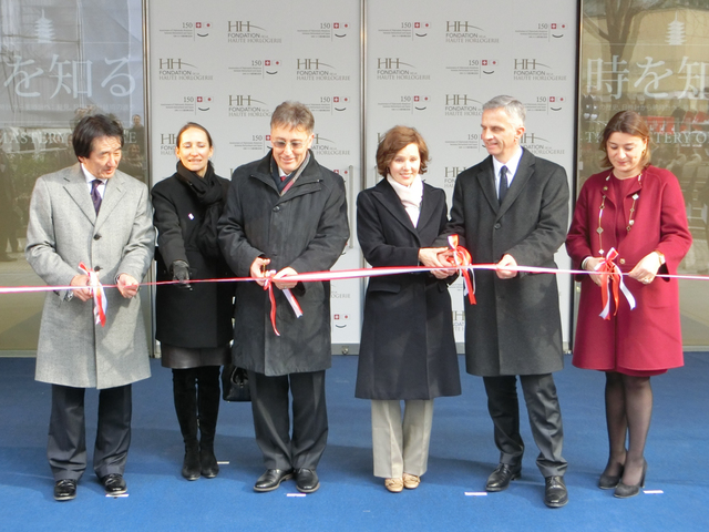 最後はスピーチをしたお二人に加え、大統領夫人、在日スイス大使、ウルス・ブーヘル閣下ご夫妻、高級時計財団日本代表の西村豊氏でテープカットが行われました。