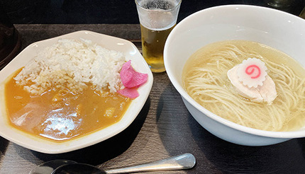 カレーは鶏ガラと魚介の風味がかなり前面にきて、なおかつスパイスも感じられて「ラーメン味のカレー」と表現してもいいくらい。シャバシャバしていてスープカレーに近いテクスチャーです。