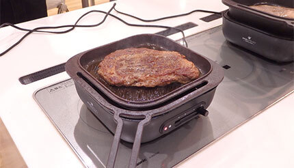 ドウシシャが担当した電気卓上コンロは「弱・中・強」で簡単に温度調節ができる。肉を焼くのに最適な230~250℃にするには「強」にする。約4分30秒という短い時間で高温に到達するのもポイントだ。あとはフライパンに肉を置くだけ。鋳物の鉄のフライパンは、温度ムラがなく均一に焼ける。