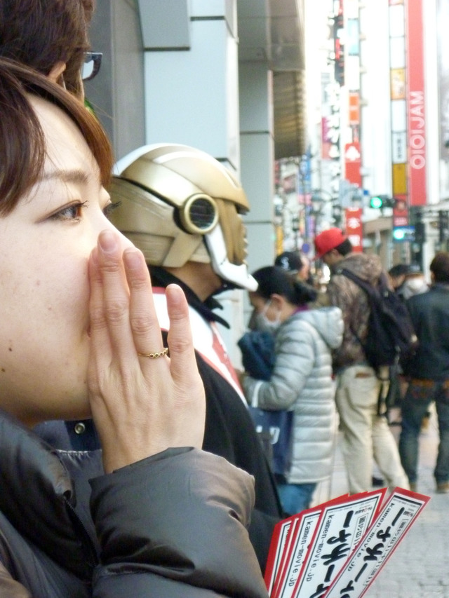 「これでDVD&Blu-rayが売れるといい」と願いつつ、スクランブル交差点をバックに記念撮影に応じてくれた、仮面宣伝マンだった。