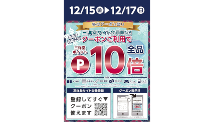 三洋堂ホールディングスは12月15~17日の期間、同社の展開する「三洋堂書店」全店において、「三洋堂ポイント」が10倍になるクーポンを発行している。
