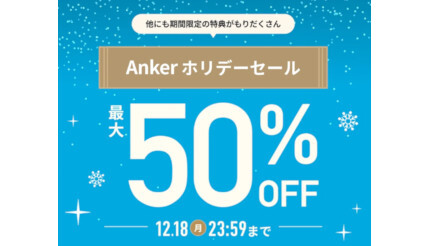 アンカー・ジャパンは12月18日23時59分まで、同社の公式サイトとアプリで最大50%オフになる「Ankerホリデーセール」を開催している。